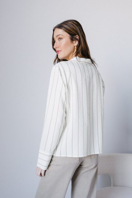 Details Striped open front topTwo tie detailsCollared necklineLong sleeves Materials and Care Shell: 100% polyesterHand wash coldHang to dry All