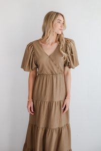 Cultivating a chic sense of style is simple, thanks to pieces like the Aesthetic Ease Taupe Tiered Maxi Dress! Designed with a flattering surplice v-neckline and soft puff sleeves, it brings just the right amount of romance to your look. The textured fabric adds depth and interest, while the tiered skirt flows with ease, creating a dreamy silhouette that moves with you. Whether you’re dressing it up for a special occasion or keeping it laid-back with sandals, this maxi is your go-to for polished, feminine style with all-day comfort! Lightweight Textured Woven Knit Fabrication Surplice V-Neckline with Functional Snap Closure Short Puff Sleeves with Elastic Cuffs Flowy Tiered Fit Maxi Length Fully Lined Self: 80% Rayon, 20% Nylon Lining: 95% Polyester, 5% Spandex Hand Wash Cold, Hang or Line Dry Model is 5’10” and wearing a Small.Garment Measurements in Inches:Small | Bust 34″ | Waist 32″ | Hips 42″ | Length 57″Medium | Bust 36″ | Waist 34″ | Hips 44″ | Length 57″Large | Bust 38″ | Waist 36″ | Hips 46″ | Length 58″