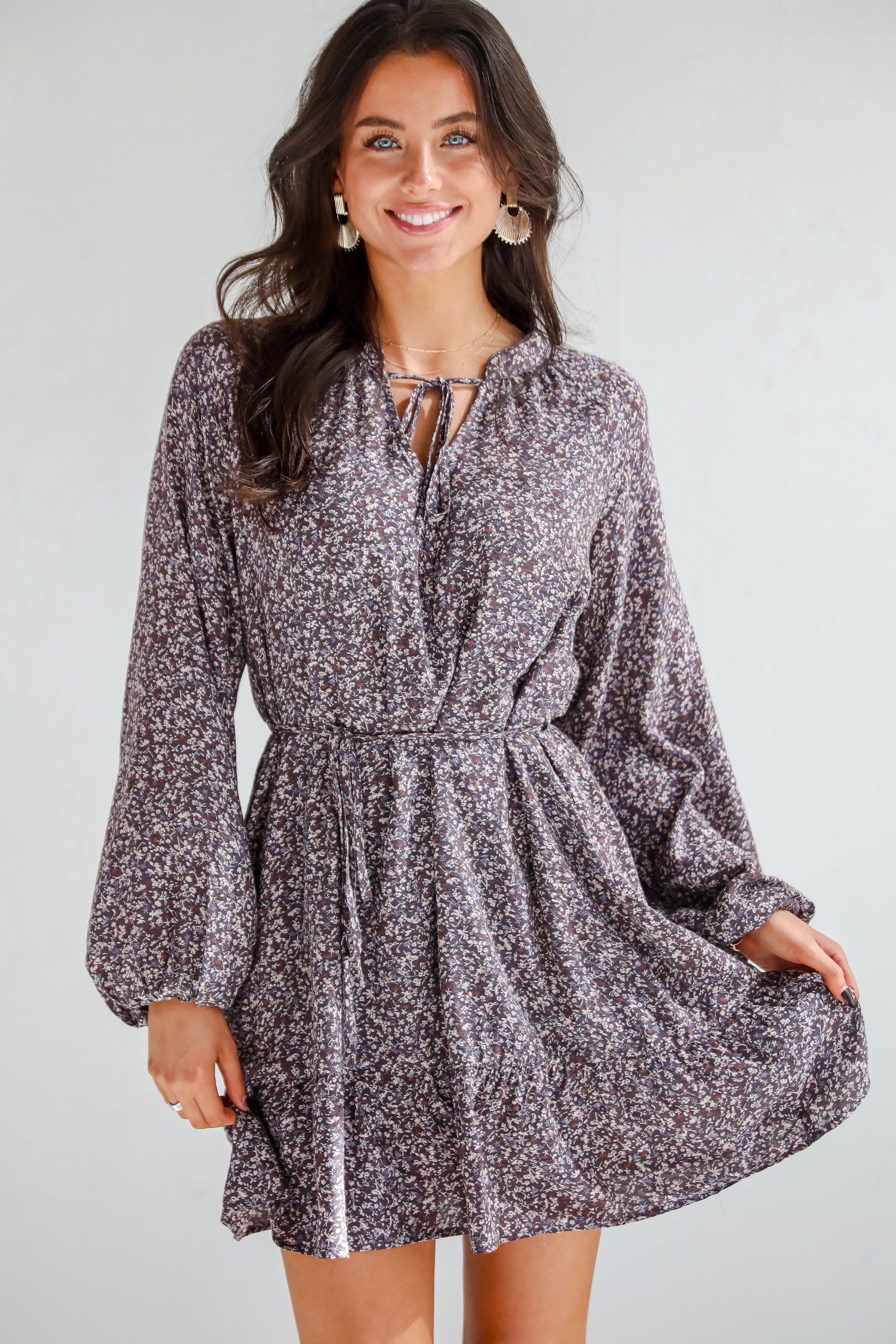 Jaws will drop and compliments will fly when you’re seen out and about in the Iconic Beauty Plum Floral Mini Dress! Crafted from lightweight, flowy fabric, this dress features a rich plum color adorned with a dainty floral print that brings a touch of nature-inspired elegance to your wardrobe. The long sleeves provide a stylish contrast, while the mini length offers a playful and flirty silhouette. With a flattering fit that accentuates your curves, this dress is perfect for both casual outings and special occasions. Pair it with ankle boots for a chic daytime look or dress it up with heels for an evening out—this mini dress is a versatile addition to any fashionista’s collection! Lightweight Woven Knit Fabrication Floral Print Notched V-Neckline with Functional Tie Long Balloon Sleeves with Elastic Cuffs Functional Tie Belt Waist Flowy Fit Ruffle Hem Short/Mini Length Lined Body, Unlined Sleeves Self: 100% Rayon Lining: 100% Polyester Hand Wash Cold, Hang or Line Dry Model is 5’4″ and wearing a Small.Garment Measurements in Inches:Small | Bust 40″ | Waist 44″ | Hips 46″ | Length 33.5″Medium | Bust 42″ | Waist 46″ | Hips 48″ | Length 34″Large | Bust 44″ | Waist 48″ | Hips 50″ | Length 34.5″X-Large | Bust 46″ | Waist 50″ | Hips 52″ | Length 35″