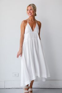 From the moment you walk in, you’ll be bringing the glamorous vibes in the Memorable Entrance White Linen Halter Midi Dress! Crafted from high-quality linen, this dress offers a lightweight and breathable feel, ensuring comfort even on the sunniest days. The halter neckline frames your shoulders beautifully, offering a flattering and feminine look that enhances your silhouette. The pristine white hue exudes freshness and sophistication, making it a versatile choice for summer gatherings and special events. Perfect for daytime events, beach weddings, or resort vacations, this dress can be dressed up with heels and statement jewelry or worn casually with sandals and a sunhat! Lightweight Crinkle Linen Fabrication Halter Neckline with Functional Tie Flowy Fit Smocked Back Side Pockets High-Low Hem Functional Drawstring Tie Waistband in the Back Midi Length 100% Cotton Hand Wash Cold, Hang or Line Dry Model is 5’6″ and wearing a Small.Garment Measurements in Inches:Small | Bust 32″ | Waist 40″ | Hips 70″ | Length 48″Medium | Bust 34″ | Waist 42″ | Hips 72″ | Length 48.5″Large | Bust 36″ | Waist 44″ | Hips 74″ | Length 49″